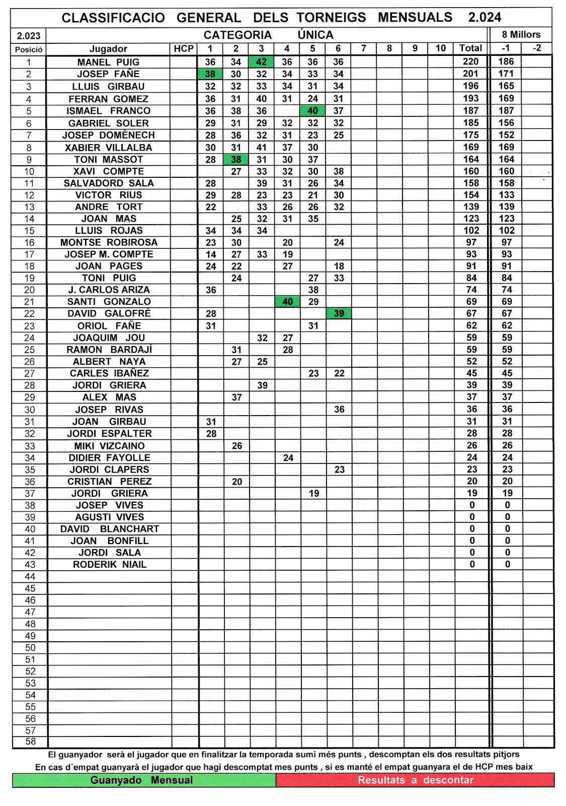 Pel que fa a la general, la primera posició l'ocupa el Manel Puig amb 220 punts, seguit a una certa distància pel Josep Fañé amb 201 i el Lluís Girbau amb 196 ocupa la tercera plaça. Però molta atenció, aquí hi ha un tapat, que és l'Isma Franco. Mostra una gran regularitat i amb una partida menys, té 187 punts, cosa que el converteix en líder virtual. La lluita està servida.